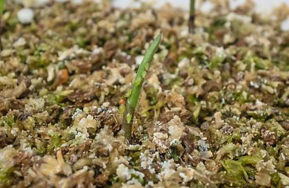 日本シュンランに新子の季節が始まろうとしています。画像中央に鎮座しているのが、最近芽を出した新子と見られる個体です。昨日現在、確認できたのはポット植え、露地植え全般を見回してこの1芽だけでした。とは言え、例年ならそろそろ新子発生のピーク期を迎えるので、遠くない時期に一斉に芽を出し始めるのではないかと注目しているところです。