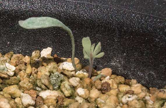 3月中旬に発芽したコマクサが、一時は20芽ほどを数えていましたが、評判通りに軟弱でこの1ヶ月半で半数余りが姿を消してしまいました。栽培指南サイトのハウツー記事に照らすと、水遣りが極めて重要だそうで、可能性としてこの点に反省すべきものがあったと思っています。 そうした中で、生き残った株に本葉を出すものが現れ始めました。画像はそうした大人への歩みを始めた中で先頭を走っている個体で、既に2枚目の本葉を見せています。これ以外の個体ではまだ1枚目を出すのがやっと・・・という状況です。こうした経過を思い起こすだけでも、この品種を育て抜くことの難しさを思い知らされている昨今です。