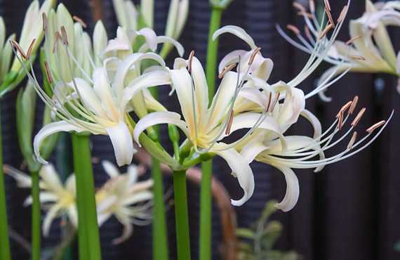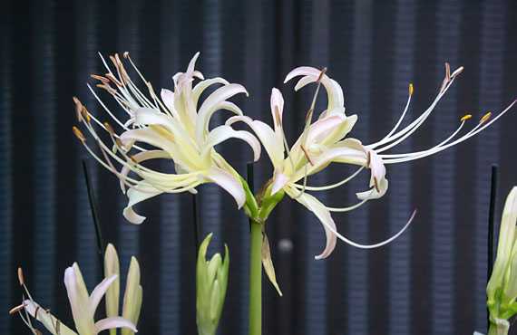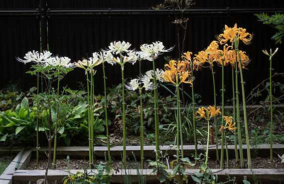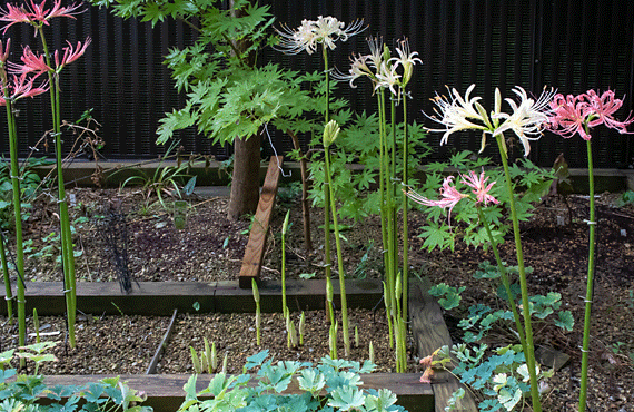 ヒガンバナの白花品が開花しました。昨年と比べて10日遅れの開花です。今年だけに着目しても、始動したのは赤花、白花共に9/13だったのが、開花は赤花の方が2日早かったことを思うと、ヒガンバナ業界(?)でも複雑な競合があるのかもしれません(冗談です ^^;)。 これまでにも、そして今回も”ヒガンバナ・白花品”と平然と書き進めて来ましたが、実際には固有の銘があるのかないのか、自生地がどこなのか、等々、正確なところは分かっていません。調達した経緯は、「見計品」として内容の説明が全くない商品の中に含まれていたもので、偶々在来種の赤花品と開花時期が重なっていたことから、ワタクシが勝手にそう呼んで来たものです。この先もこの運用を継続するつもりですので、お含み置きください。