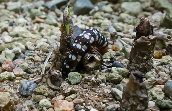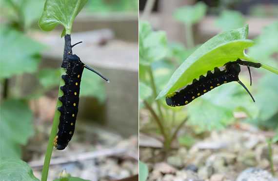 カラスビシャク(烏柄杓)に取り付いて脱皮を済ませたばかりのセスジスズメ(背筋雀)蛾の幼虫です。脱皮中は採餌が止まるので、一時的に食害の進行は止まりますが、脱皮する度に体型は大きくなり、食害は更にひどくなります。発見時点で体長は3cmほどでしたが、数回の脱皮を繰り返し、最大9cmにもなるとされています。蛇足ですがトゲのある方がお尻だそうです。 この画像を撮影した位置から半径50cm内で両手に余る(数の)個体を発見しました。駆除はいつものキ●チョールが極めて有効で、チョイ吹きしただけで数秒で歩行不能となります。以前これが発生した際には数10匹を発見したことを思い起こすと、範囲を広げて捜索すれば、数は更に増える可能性もあります。当面は小庭の巡回ペースを下げることはできそうにありません。