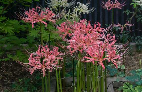 ピンク花リコリス「さつま美人」が見頃を迎えました。昨年より1週間ほど遅れての見頃到来です。花のボリューム感は昨年と同じ程度です。背後の白い一群は「アルビ・フローラ」ですが、昨年はほぼ同時に見頃を迎えたのですが、今年は「アルビ・フローラ」のピークが1週間ほど遅れそうで、この2品が並び立つことはなさそうです。但し、「アルビ・フローラ」のボリュームは、画像のピンク花の2倍以上に達しそうで、見応えは史上最大になるかもしれません。