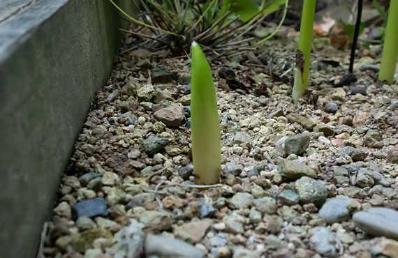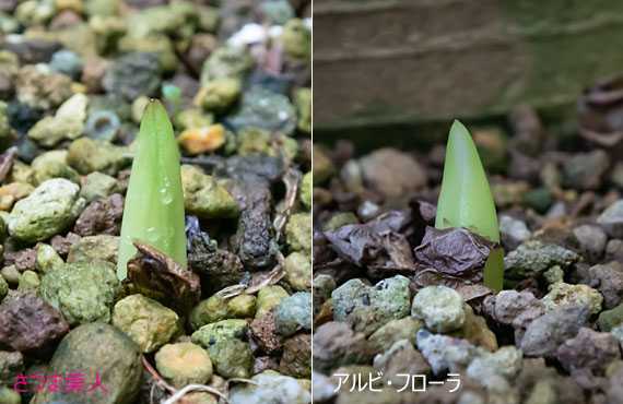 ヒガンバナの白花品が始動しました。この時期に始動すれば、ちょうど彼岸の時期に見頃を迎える筈で、実にいいタイミングで動き始めてくれた、というのが素直な感想です。向かって右側後方に一足早く始動したものが写っていますが、これは何年か前に球根が混ざり込んでしまったピンク花の「さつま美人」で、元々は1株だけだったものが今では3~4株に増えて、一定の勢力になり始めています。 ヒガンバナ白花が幾分早めに始動し、本来ならもう少し先行する筈の「さつま美人」や「アルビ・フロ-ラ」の立ち上がりが少し遅れたことで、滅多に起きない混戦模様が見られるかもしれません。それも在来種の赤花品次第ですが、昨年初冬に大発生したハマオモトヨトウの被害の程度次第で、間もなくそれがはっきりします。