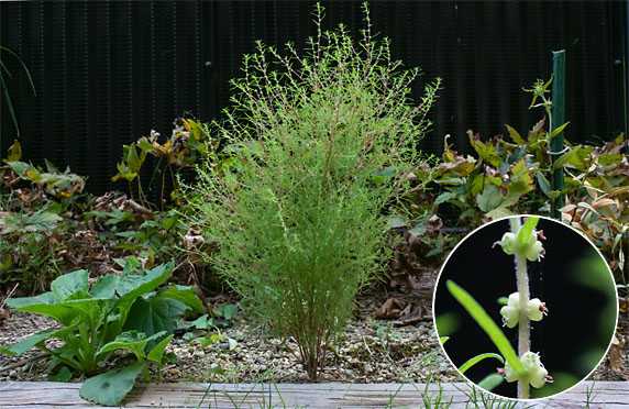 後1ヶ月経つか経たないうちに紅葉するというのに、我が家のコキアは草丈40cmにも届かない生育不順ぶりです。まあ、植え付けが遅かった(6月上旬)と言えばその通りですが、何分にも地元でこの品の苗が流通に乗ることは殆どないことを思うと、これも「やむなし」ということかもしれません。 その生育不良のコキアに花が咲き始めました(円内)。ググってみると、紅葉が終る頃に種子が成熟する様です、その種子を食用に回せば「とんぶり」になるそうですが、今回は全量を種蒔きに使うつもりです。植え付けを2ヶ月ほど早めて、ひたち海浜公園のコキアの様なリッパな株を育ててみたいと思っています。