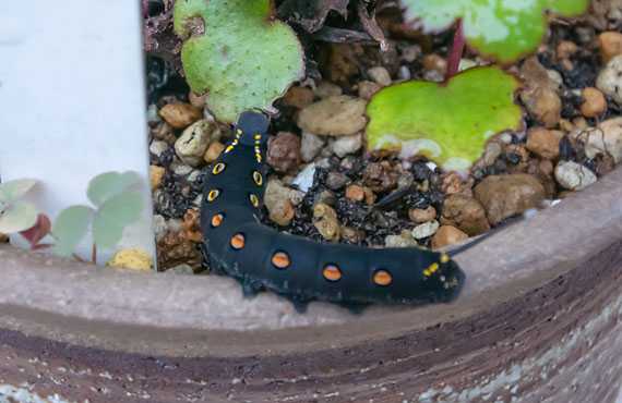 過去に例がない様な強力な台風14号が近くを通ると、テレビでは大騒ぎです。大事な花鉢が吹き飛ばされてはかなわん、ということで、最も大事な、または軟弱な数鉢は屋内に避難させ、その他大多数は屋外ですが比較的風当たりが和らぐ場所に移動しました。 そうした移動作業をしていて、出くわしたのが画像のセスジスズメです。全く心の準備ができていない状態でこうした芋虫や毛虫に距離数cmで気付いた時のビックリ度は半端ではなく、今回の遭遇でも危うく鉢を落しそうになってしまいました。すんでのところで意識を立て直し、一旦は平坦な場所に置いて、いつもの駆虫剤キ●チョールを取りに走りました。 という様な大事件(?)にも遭遇しつつ、何とか8割方の鉢を避難させ、大災害は避けられるんじゃないかなあ、という状態に漕ぎ着けました。残る2割は土壌の重量が大きく、風で飛ばされる可能性が小さいものです。今日1日、何とか無難に過ぎて欲しいものですが、果してどうなることか ....