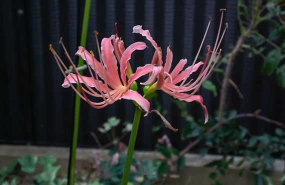 昨日は台風14号の接近に伴い、昼過ぎから強い風に見舞われました。そんな嵐のさ中、ピンク花リコリス「さつま美人」が開花しました。昨年と比べて4日遅れの開花です。強風の中での撮影になったため、4-5枚写して何とか静止状態で撮れたのはこの1枚だけでした。 何とか撮れたとは言ってみたものの、花の形は何か変です。普通なら6輪ほどで構成される花序が4輪しか見当たりません。理由は2週間前、この花芽が芽を出しを始める直前、ハマオモトヨトウ(浜万年青夜盗)の幼虫にツボミの成長点を喰われてしまい、ツボミの一部を失ってしまったためです。一時は開花そのものをも危ぶんでいましたが、喰い残した4輪は何とか開花まで漕ぎ着けました。先頭走者の食害に続き、今度は後続の花芽が強い風に揉みくちゃにされてしまいました。薄暗い外の様子を、音で窺う限りでは、何とか峠は過ぎた様に感じられます。明るくなり次第、外の様子を見に行くことにします。
