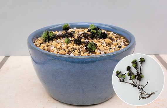 この夏、甚だしく精彩を欠く様になったシコタンソウ(色丹草)を立て直すべく、当該ポットから株の一部を採取し、別のポットに植え付けて来ました。この10日ほどで2鉢の再生株を準備して来ましたが、最もクリチカルな植付け直後、定着できるかどうかの危機ゾーンは何とか切り抜けられそうな好感触を得ています。あと1-2週間も待てば確定的な判断が下せるかと思いますが、それまでに3番目のポットを準備することにしました。 ということで老化の進んだポットから根付きの株の一部を採取したのが上画像の円内です。シコタンソウは長く伸びた細い茎が地面に接したところで発根し、ここを新たな拠点にして更に茎を伸ばして勢力を広げますが、採取したのは途中で発根、成長した根を含む茎の一部です。これを種蒔き専用として配合された微粒の用土で3号ポットに植え付けて定着を期することになります。当面は洗面所に置いて、2ー3時間ごとに様子が見られる環境に置いて監視していきます。