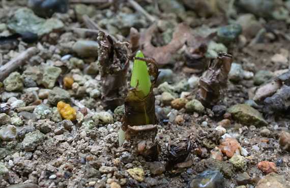シュンラン(春蘭)の花芽が動き始めていました。画像でピンクでマーキングした大小の円錐形の突起がそれで、葉の陰に隠れたものも含めれば、画像に写り込んだ群落内で5芽の花芽が確認できました。今月中は新たな花芽が発生する可能性も残されており、”追い花芽”への期待は膨らみます。 この春、この群落では2芽の花芽が立ち上がりました。仮に追加発生がないとしても、来春は前年比2.5倍の開花が期待できることになり、思わずにやけてしまいそうな嬉しい兆候です。尚、開花時期はサクラが終る頃なので、助走期間は7ヶ月という長丁場になります。