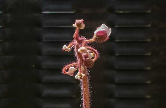 初夏に咲く花として一昨日から2点取り上げましたが、地味な存在の2品種を取りこぼしていました。既に開花への歩みを始めているユキノシタと八重咲ユキノシタで、画像はその内の八重咲ユキノシタです。 昨年の開花日は5/9でした。今年も既に準備は始まっており、昨年並みの開花は実現しそうです。花軸や葉の裏、葉柄など、ほぼ全身が、画像の通りどぎつい赤で装っています。”草花”の装束としては少数派だろうと思われます。装束と比べれば花は白基調で清楚な印象を振り撒いています。花期は半月ほど続きます。