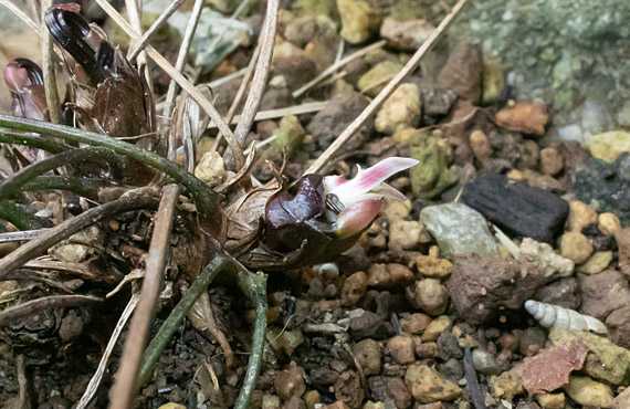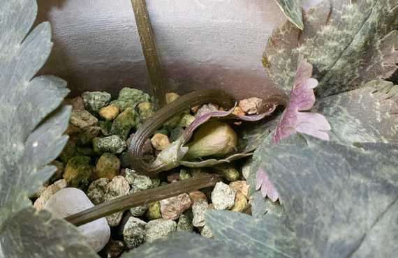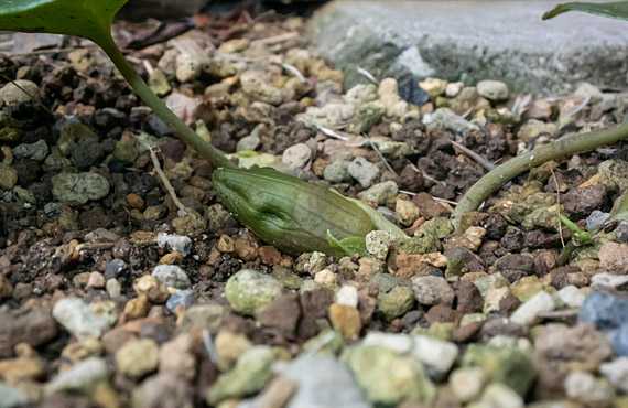 周期的な暖かさや冷え込みにも、「我関せず」とばかりにマイペースを貫くコシノカンアオイ(越ノ寒葵)です。豪雪をもたらす寒気にも、人が浮かれる様な暖気にも左右されることなく、静かに膨らみを増しています。今の花(・・・と言っても、ピーナッツの殻ぐらいの固さですが)の大きさは単4乾電池を半分に切ったぐらいです。ピーナッツより若干大きいか?といったサイズです。 昨年はこの品は作落ちしてしまいましたが、今年は間違いはなさそうです。例年の開花時期は2月中旬から下旬。まだ1ヶ月ほど密やかな歩みは続きます。