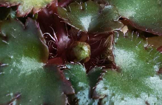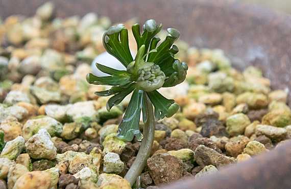 この寒さの中で、事もあろうに秋の花、ダイモンジソウがツボミを始動させました。「瀬戸翠」の銘を持つ、淡い緑の花を咲かせる美麗種です。という風に大袈裟に書き始めると、いかにも珍しいことが起きように思ってしまいがちですが、実は一昨年も似たことが起きていました。白花のダイモンジソウ(無銘ですが・・・)が12/28に咲き始めたことがありました。因みに、その年の「瀬戸翠」は平均的な11/2に咲いています。 昨年後半「瀬戸翠」に関わる履歴を掘り起こしてみると、ポット一杯に生い茂っていた株が、秋口に一斉に枯れてしまいました。全滅か・・・と一時は落ち込んだりもしたものですが、11月に入った頃、そうした枯れ株のいくつかから新芽が伸び始めました。このポットはその時芽を出した内の1株を移植したものです。寒さの中で日毎に葉っぱを充実させる様子を見ていて、全滅の危機からは脱したことを内心喜んでいたのですが、今回のツボミ発生は、大きなおまけが付いていた様なもので喜びは倍増です。尚、ツボミが寒気で凍傷など負わない様、暫くは屋内に撤収することにします。