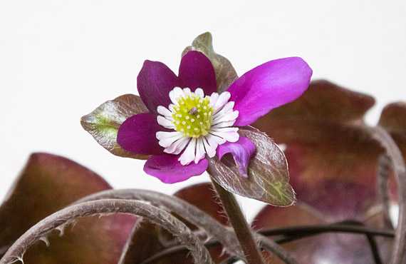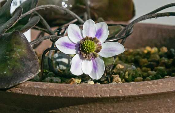 雪割草の当年1番手が開花しました。二段咲で白花・赤紫シベの美品なのですが、現状では花弁の中央部に紫が残り、シベも伸び切っていません。最終的にはこんな容姿に変わる筈なんですが、この個体で花弁の紫の滲みが消えるかどうかについては、少々自信がぐらついています。完全に化け切るまでには1週間以上かかるので、その様子は後日紹介したいと思います。 ところでこの個体、2ヶ月近くも前にツボミが動き始め、管理人(ワタクシ)を慌てさせた代物です。年が変わるのを待たずに開花してしまわないかハラハラさせられたものですが、何とか暴走は思い止まってくれて、この日を迎えることができました。蛇足になりますが、昨年1年間で72品種の開花を見届けました。今年は新顔や作落ち品のリカバリーもありそうで、80品種以上を目標にしているのですが、開花が年明けまで伸びたことで、晴れて本年第1号を記録することができました。
