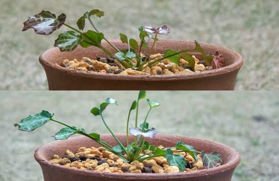 1ヶ月ほど前、姫路からリクルートして来たイワウチワを植え替えた際、株の塊から幾分膨れる様に伸びた部分を切り離して、別のポットに定植していました(画像・上)。切り離した根が貧弱だったため、冷え込みや乾燥が重荷にならない様に・・・ということで、屋内に収容していました。保管場所は洗面所で最高気温は20℃前後、最低気温は12-13℃を下回ることはなかった筈です。 株切り分けのダメージからは意外に早く立ち直った様で、当初根元付近で小さな塊の様にまとまっていた葉っぱが、年が明けた頃には徐々に伸び始め、今では当初から茂っていた古い葉と肩を並べるほどに伸びてしまいました。この他、当初は古い葉っぱは赤茶色を帯びていましたが、屋内に収容した頃から徐々に緑に変化し、その頃の色合いは殆ど残っていません。こんな具合で、外見上はポジティブな変化を一身に集めた形ですが、花付きに関しては今年は期待できそうにありません。花の方は来年に期待することにして、株の地力充実へのサポートを続けることにします。