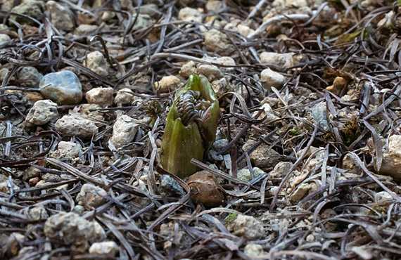 半月ほど前に、ユキワリイチゲの花芽が動き始めた件について、この欄で紹介しました。後続の花芽もすぐに動き始めるか、などと軽く見ていたのですが、予想外にガードは固く、半月もの間新芽は見られませんでした。 年の瀬ぐらいから気候はやや緩みぎみに推移していますが、これだけがきっかけになった訳でもないでしょうが、ここに来て続々と花芽が顔出しを始めました。画像は500円玉1個半ほどのエリアに4芽の花芽が顔出しした様子です。どうやら半月前のは様子見で顔を出したもので、今姿を見せているのが本隊という位置付けになるのかもしれません。とは言え、花の時期は1ヶ月余り先のことで、慎重な助走を続けることになります。