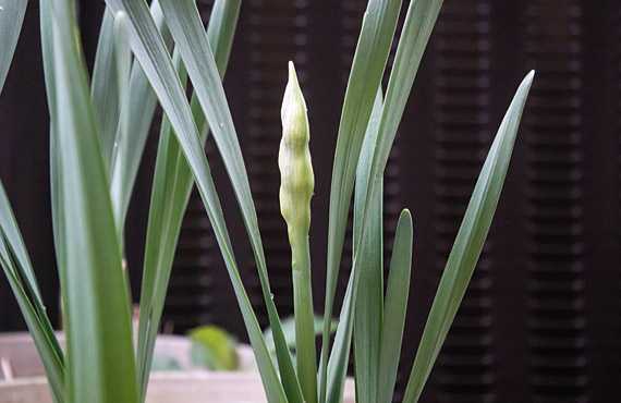 八重咲スイセンが開花に向けて仕上げ段階に入った様です。昨年の1番花開花は1/14だったので、かなり遅れて推移していることになります。では、今年はいつ頃になりそうか? ・・・・・・・。つまり、分からない、というのが一番確からしい答ですが、それでは管理者の責任放棄ということになるので、あと1週間ぐらい、ということにしておきます。 この個体群の起源は淡路島の某所です。河川改修工事に我が家が引っ掛かり、引越しせざるを得なくなり、その際、近くの田圃の水路脇に自生していたものから、球根1個を失敬して来たものが起源です。定植していた先には濃厚な肥料を施していたことから、花軸が60cmに達するまで大きく育つ様になってしまい、スイセンの持ち味である可愛さ、可憐さが感じられなくなっていました。で、培地をプランタに戻して4年間、水以外の一切の肥料分を絶って来ました。この効果がやっと現れ、今年は30cm程度の標準的なサイズが実現しそうです。祝・念願達成(見込み)・・・・だな。