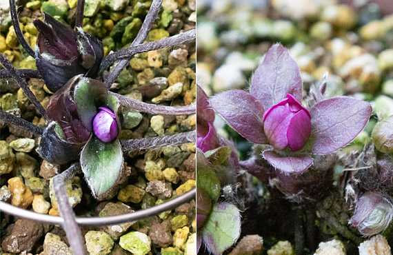 昨日は雪割草の2番手開花を紹介しました。それは我が家で保有する約100点の中の2品種目でもあります。という具合で、現時点でツボミが実際に動いているのは雪割草だけです。 という風に全品を見渡して、次に開花しそうなものを取り上げると、やはり雪割草に行き着きます。それが上画像の2点です。右は標準花、赤花白シベの品、左は品名ラベルが家出(!?)して、何か分からない状態の品物です。開花した花を見れば品種品名は分かる、ということでこれまで放置していましたが、こんなことで管理の杜撰さがバレてしまいました。これらの開花は月が替わる頃か、などと予想しているのですが、このところ予想は外れまくっているので、アテにはできません(悪しからず・・・)。