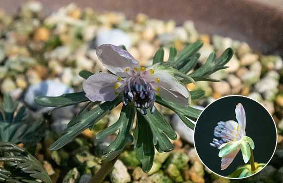 花の時期に向けて静かに歩みを進めるユキワリイチゲです。そのポットの空地の様な隙間に毛色の変わった新芽を見付けました。主たる住人が茶色を帯びた迷彩色であるのに対して、新芽は鮮やかな緑です。また葉っぱの切れ込みは主たる住人の方はごく浅いのに対して、新芽は葉っぱの中心に届くか、という程、深く切れ込んでいます。といった外形的な差だけでも、両者に親子関係はなさそうです。 だったら、この子は誰の子?という点が問題になります。深い切れ込みを有する葉の品種としては、我が家で保有するのはニリンソウとキクザキイチゲが該当しますが、後者はこの10年ほど花は咲かせておらず、候補から外れます。ということで、この新顔はニリンソウではなかろうか、という結論に達しました。ニリンソウの場合発芽初年度は二枚葉からスタートするのですが、現段階で既に本葉を出しています。ということは、この子は既に2年目以上と考えられます。成長の大事な季節を、住人の葉陰で過ごすというのは成長上の大きなハンディですが、そうした不利な条件でも子ファミリーを形成して行けるか見届けてやろうと思います。