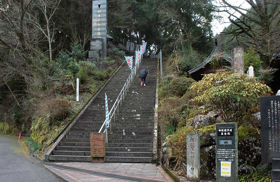行って来ました。熊本県美里町の釈迦院の日本一階段遊歩道。そして、全段踏破達成です。感想は?・・・と言うと、只々辛かった、の一語び尽きます。その辛さも、登りと降りでは様子が違います。登りでは筋肉疲労で私の場合は太腿から腰の筋肉疲労で歩きが止まってしまいます。ただ、こちらは休憩すれが筋力はある程度回復するのに対して、降りでは膝の関節回りに疲労が溜まります。こちらは休憩しても回復することはなく、段数を重ねるに連れ、衝撃を受け止める能力が減衰し、スタート地点まで戻った時には、膝の「く」の字が逆に曲がりはしないか、と思うくらい疲れていました。当分階段には近付きたくない心境です。 さて、上画像は階段入口の様子、下画像は最上段まで登り切った場所に立てられている石碑です。この他に100段毎に段数を告知する石碑が立っていて、今自分がどの辺に入るかを知ることができます。階段の高さは16~17cmと見積もりましたが、生憎スケールを持ち合わせていなかったので正確性には欠けることをご理解ください。 歩き終わってそのまま690km車を走らせて、先ほど4時頃神戸まで帰って来ました。眠気は半端なく襲って来ており、昼頃まで寝るつもりです。そのまま夜まで・・・という事態も考えられますが、筋肉痛で他には何もできそうにないので、「通し寝」も可、としておきます。