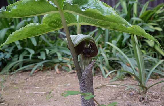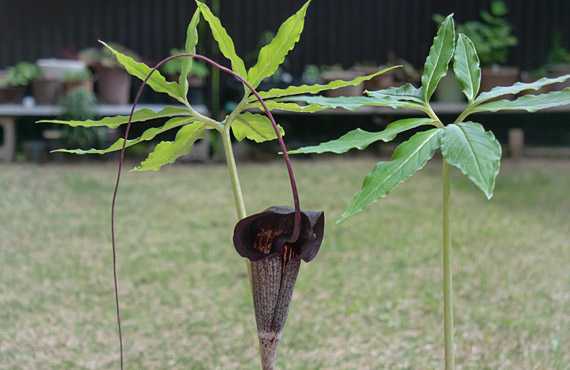 不気味系四天王の番外品、カラスビシャク(烏柄杓)も店開きしました。図体は単4乾電池ほどのミニサイズなので、不気味さは皆無ですが、分類上は同じ仲間です。カラスビシャクそのものは個体数は大量に繁茂しているのですが、仏炎苞を出すのは極めて少なく、今年もこの1点の他には気配を見せていません。ぶっちゃけた話、この品が大量に花開くのは困りものですが、全滅されるのも寂しい話です。適度の生存が望ましい・・・とは言いながら、そうそう都合よくコトが運ぶ訳もなく、頭痛のタネとの共生は続きます。