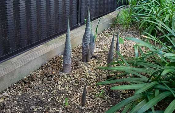 リコリス群の陰に隠れて、普段の行動パターンでは目に付きにくいムサシアブミ(武蔵鐙)が、大きく図体を伸ばして、店開きが間近であることを主張しています。芝生の草抜きが一巡して、プチ花壇の草抜きに手を付けた際気付いたもので、撮影は4/2です。この状態を踏まえて、仏炎苞の御開帳は、昨年(4/9)並みか、若干遅れるくらいか、と予想していますが、果してどうなることか ... それはそれとして、この品種も個体数が増えて、扱いに困る状態に立ち至ってしまいました。この場所に収容できるのは2芽か3芽で、それを超える分は新たな居場所が必要です。近年個体数の減少が著しいとも言われており、新たな安住の地探しに本気で取り組まなくてはいけません。