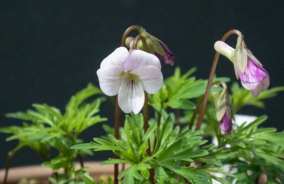 紅ヒゴスミレが開花しました。昨年と比べて13日遅い開花です。ここでも暖冬に反しての割り切れなさが漂います。 それはそれとして、名前に「紅」を冠しながら、花の命である顔を正面から見ると「紅」は殆ど感じさせません。実は赤いのは「裏の顔」だけで、画像右のツボミの頃には確かに「紅」を帯びています。ということで嘘つき商品とまでは言いませんが、誠に残念な命名ではあります。もう一つの特徴として、葉っぱに細かなフギレが入る点が挙げられます。こうしたフギレはスミレでは珍しいらしく、ワタクシとしてはこのフギレに釣られてしまった・・・というのが正直な話です。