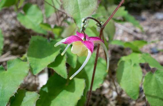 イカリソウの2番手「楊貴妃」が開花しました。昨年と比べて2日遅れ・・・ということは、事実上同日と見做したい範囲です。昨日取り上げた「アンバークイーン」は、いきなり大量のツボミを送り出しましたが、こちら「楊貴妃」は慎重に1輪だけ送り出して様子を見ている様に見えます。小さいツボミは鈴生りになっていますが、すぐに後を追って開花しそうなツボミは見当たりません。1番花が散った後は少しブランクがありそうです。 と言った概況は横に置いて、淡いベージュの距と濃いピンクの萼弁の組み合わせは絶妙で、歴史的な美女の名に恥じない美しさです。今年は開花適齢期の個体数が少し増えており、楽しみは増えそうです。