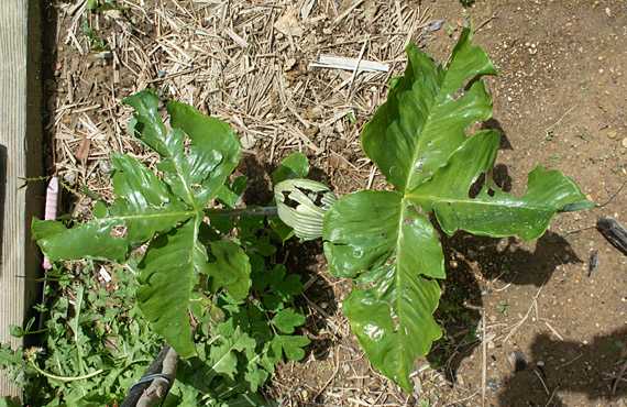一昨日の夜(16日・夜)は、この地方もかなり荒れた様です。報道によると、神戸市から姫路市にかけて雷雨と共に最大6.5cmに達する雹も降ったと言われています。カーテン越しに空が明るく照らし出されるのは認識しており、当然激しい雨はあるものと思っていましたが、雹までは想像していませんでした。 一夜明けて外に出てみると、屋外に配置した草花が手痛いダメージを受けていることに愕然としました。ツボミが膨らみ始めたばかりのクロユリは、再起不能な状態まで傷んでいます。画像は葉や仏炎苞の面積が大きく、被害が顕著に視認できるムサシアブミです。葉も仏炎苞も穴だらけといった有様で、今年はこのまま枯れるのを待つ他はありません。見た範囲では6.5cmの大型が降った形跡は見られませんでしたが、梅の実サイズのものはあったかもしれません。いやはや何とも実害の大きい気象現象に遭遇したものです。