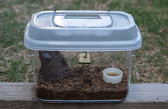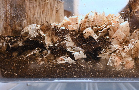 オオクワガタをリクルートして丸1日が過ぎました。早朝5時には地上に出ていましたが、顔を洗ってカメラ片手に覗いた時には、姿はありませんでした。そそくさと地下に潜ってしまった様です。新しく投入した餌はかなり減っていたので、夜間照明が消えた時間帯は地上に出て採餌行動を行った様子が窺えました。 5cmほど敷き詰められた土壌はトンネルが穿たれています(鎖線の範囲)。このトンネルは、道の駅で清算した際、雌雄の2個体が生きていることを確認してくれた際、ほぼ全域を掘り返していたので、今存在するのは1日足らずで掘り直したものと断定できます。中々姿を見せない相手を画像に収めるには、少々手荒な作業が必要かもしてません。