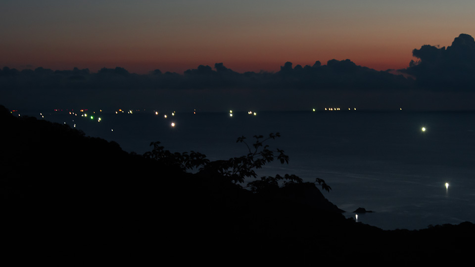 そろそろ漁も終盤に差し掛かるらしい・・・ということで、2日の間隔をとっただけで、漁火見物に行って来ました。同じコースを3回目となると、NAVIの癖もカバーできる様になり、スムーズな往還が果たせる様になります。それでも午後2時には自宅を出て、帰宅は深夜11時を過ぎてしまいます。 今回紹介するのは、残照を背景にした漁火の様子です。つまり岬の先端から西の方向を見たものです。これまではこの方角では出船数は少なく、寂しい絵面になりがちでしたが、昨日は何時もより照明が賑わっていたので、残照の終り際にカメラを向けてみました。もう少し灯りの密度が高まればいいのですが、その辺は次の漁期に期待しようと思います。