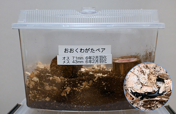 4日前にスズムシをリクルートした件を紹介しましたが、今回はオオクワガタです。スズムシと似た筋書きになりますが、ふと立ち寄った道の駅で、地元産の農産物と並んでいたものを買い求めたものです(\3000也)。スズムシと言い、今回のオオクワガタと言い、「まるで小学生じゃん」と言われそうですが、ご尤もなご指摘です。子供の頃には天然物を探して山野を彷徨ったものですが、今は養殖技術が進んで、手ごろな値段で出回っている様です。全身画像も紹介できればよかったのですが、充填した土壌に潜って、体の一部しか見せてくれませんでした。こちらは、いずれ機会を見て紹介したいと思います。