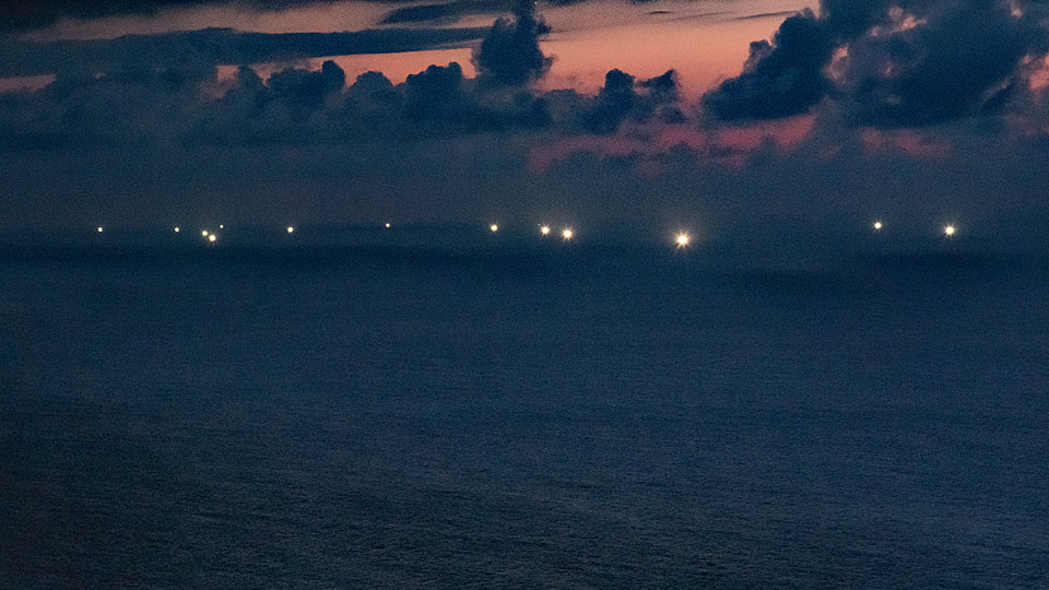 又かよ・・・と言われそうですが、イカ漁の漁火見物ツアーに行って来ました。往路全行程の半分弱のところで、集中豪雨と言っても良さそうな夕立に見舞われました。こんなことでは現地の空気は最悪・・・を予感させられましたが、ダメ元でツアーを強行した結果、予想通り酷いコンディションで、漁火はぼやけや滲みが出て、甚だ見苦しい画像しか得られませんでした。 前回は東の海上を狙って撮影しましたが、今回取り上げたのは西方向にカメラを向けたものです。画像で右から1/3ほどの方角に隠岐諸島がある筈なのですが、海上の霞や夕闇に包まれで、画像には写っていません。もう少しコンディションのいい時に再訪したいところなのですが、漁期はそろそろ終わるとの話もあり、チャンスの有無は微妙です。