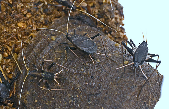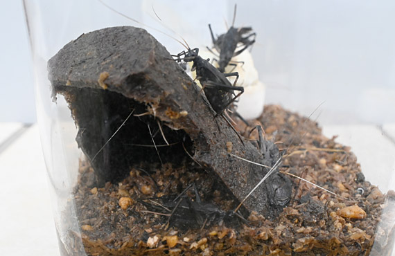 スズムシをリクルートして10日経ちました。脱皮は全個体1回は済ませた様です。一昨日朝には初鳴きを確認しましたが、静かな部屋で録音を・・・ということで、別の部屋に移動したところ、移動先の雰囲気が気に入らなかったのか、その後40時間ほど一声も発していません。こうした状況では録音どころではなかろう、ということで元の位置に戻してしまいました。因みに鳴き声は、澄んだ鈴の音とは程遠く、音に濁りが感じられました。まだまだ修行が必要な様です。 初鳴きしたのは画像中央の個体の様に、ほぼ成虫サイズに成長したものだろう、などと推測しているのですが、確認した訳ではありません。このサイズに育った個体が昨日現在2匹確認できます。残る8割ほどは画像右か左のサイズで、羽は成長し切っていないか、まだ生えてもいない状態(雌?)で、このグループは「泣くに泣けない」状態です。本番は9月・・・ということで、当面は過大な期待は控えることにします。