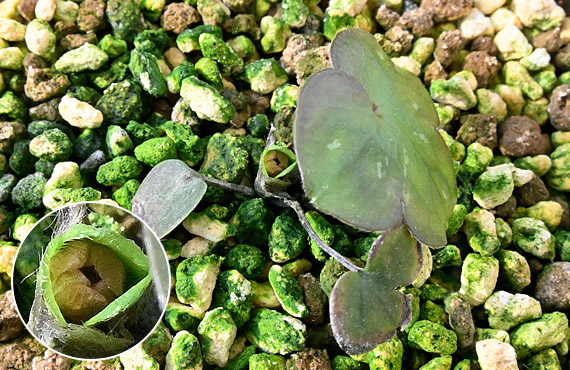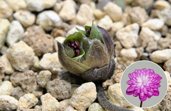 この場でも何回か取り上げて来た、実生2年雪割草がツボミを付けた一件の顛末です。今年に入って成長の主体がツボミから葉っぱに変わったという主旨の書込みを1/10に掲載しました。この傾向は今も変化はありません。然らばツボミはどうなった?、という疑問が、頭の片隅で膨らみ続けました。 で、どうにも我慢できなくなって、殆ど閉じてしまった萼弁を爪楊枝で掻き分けて覗いてみました。結果は円内に示した通りで、花弁は茶色く変色していました。茶色=枯葉色 という公式は否定できず、残念ながら実生2年の最短での開花という期待は、見果てぬ夢に終ってしまいました。南無・・・・ 但し、今回の選抜からは漏れてしまった同い年の個体20株余りが屋外で寒さに耐えながら控えており、この子たちの中に記録に挑戦してくれるものがあれば・・・・などと甘い期待を寄せています。