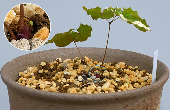 無銘(!!)ではない筈ですが、名前は知らないボタン(牡丹)です。実生で2年か3年かと思うのですが、品名ラベルの文字が消えてしまい、今は名無し同然になってしまいました。 その名無しボタンが、昨年春には外から幹は認識できませんでしたが、今年はやっと目視できる状態になり、改めて樹木であることを認識した次第です。地上に出た幹は1cmあるかどうか、といった小さな存在ですが、足元には早くも枝が伸びようとしています(円内)。 実生でスタートしたものが初花を見せるまで7年ほどかかる、というのが通説です。最短で花を見るには、根で集めた養分は全て自身の成長に使い切る必要があります。ということで、葉っぱが出始める前に、この枝は切り取ることにします。初花まで後4年か5年、それまではコロナやインフルの流れ弾には当たりたくないものです。