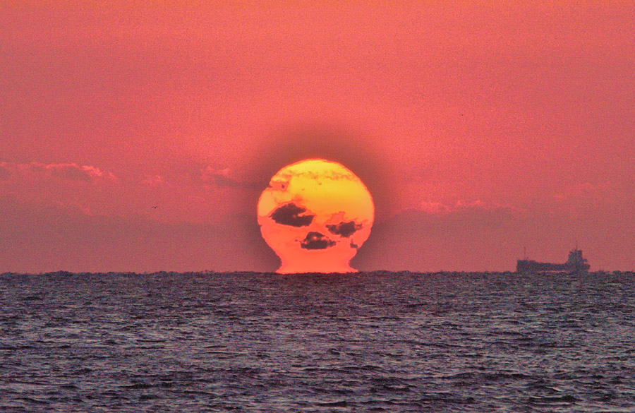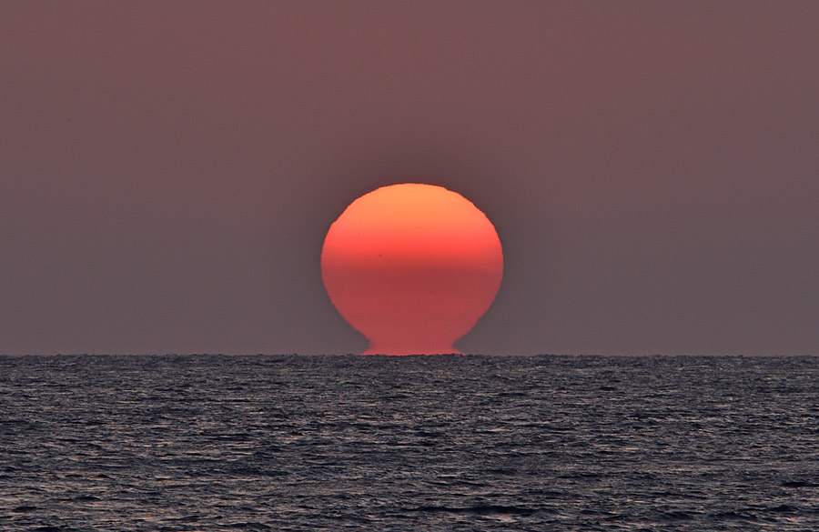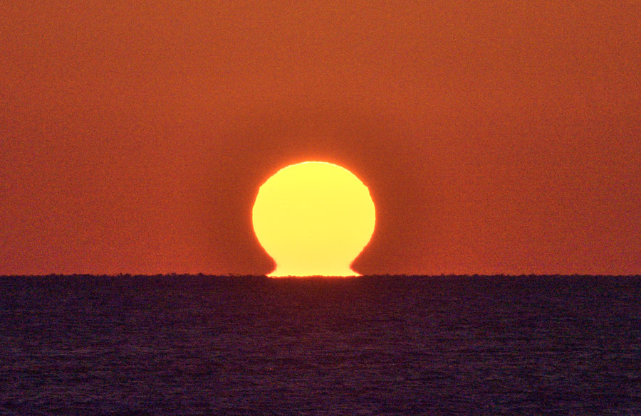 新年2日目も、雲を探しても見付からない様な晴天でした。前日の失敗の汚名返上・・・とばかりに再度出掛けてみました。 2日目の西の空模様は、冒頭にも記した通り雲らしい雲は見当たりませんでしたが、水平線ギリギリには薄い雲か水蒸気が充満しているらしく、太陽2個分ほどの高さ以下では、肉眼でも直視できるほどに明るさは落ちていました。お陰でいつもの様な露出補正は全く必要なく、普通に風景を撮る様なカメラ操作で撮影できました。画像で太陽の下半分が暗くなっているのは、この影響が極端に現れたことによるものです。この結果、撮影は楽でしたが、印象の薄いものとなってしまいました。また、だるまの肩が薄いのは水温と気温の差が小さくなっているためと考えられます。直近の海水温は機器故障のために公表されていません。この先この温度差は着実に下がるので、状況は益々悪くなると覚悟する必要がありそうです。