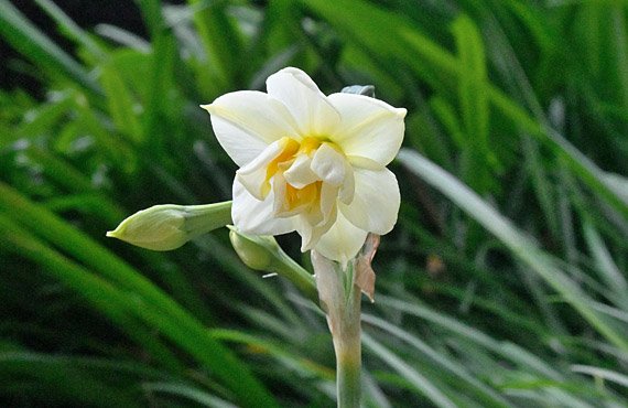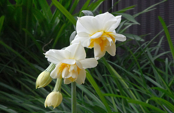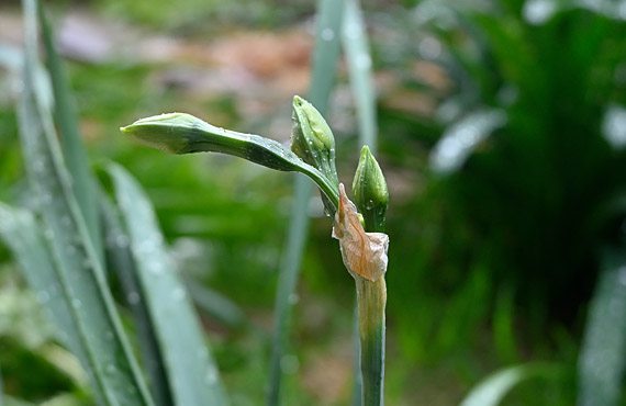 これまで何度か取り上げて来た八重咲スイセンは、プランタに植え付けた個体群でした。プランタ組はダイエット中で、肥料分はギリギリなまで切り詰めているため、開花への歩みはやや遅れ気味で、花芽は今でもおデコが見え始めたばかりです。 それに対して今回取り上げたものは、昨年プランタ組の植え替えを行った際、密度適正化のためにあぶれた球根を、適切な時期に自然に還すために、プチ菜園の隅に仮植えしたまま、存在を忘れていたものです。プチ菜園はダイエットとは無縁で、発酵牛糞など濃厚な肥料を施しているため、短期間に肥大化してしまった様です。数年前、露地植えしていた頃には、花軸が60cmを超えるものが出てしまい、プランタに移してダイエットに取り掛かったものが、この個体はそうした縛りから抜け出し我が世の春を満喫している様です。この個体は花後、早い機会に自然に還すことにします。因みに、この個体の開花は今月半ばぐらいになろうかと思われます。