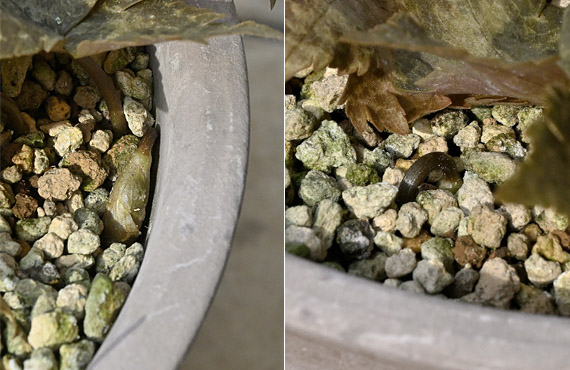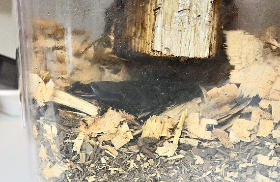冬眠している様で、実は覚めているオオクワガタの近況です。オスの方は日中は地下に潜り姿を潜めているが、夜間(深夜0時から5時)には這い出して来て、しっかり採餌する・・・という生活を繰り返しています。画像は当人はおが屑の層に潜って隠れているつもりかもしれませんが、透明プラスチックを介して外から見ると全身丸見えの様子です。 一方メスの方はおが屑を被ったり露出したりという、どっちつかずな状態を続けています。「おが屑を被ったり露出したり」というのは、実際のところオスが派手に動き回ることで、おが屑が飛び散って起きる現象かもしれません。この半月ほどは動く姿を見ていないので、実際には休眠に入ったか、もしかすると神に召されたかもしれません。後者なら2週間も経つと筋肉組織が分解してしまい、関節の一部がバラけそうなものですが、そうした症状は出ていないので、眠っているのかもしれません。 という具合で、本来ならグッスリ眠っている筈の昆虫が、最低気温17-8℃の中途半端な室温に騙されて、どっち付かずな生活を強いられている・・・という状態を紹介しました。