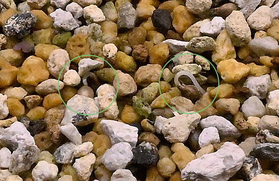 寒さの本番はこれから・・・というこの時期なのですが、屋内に避難させていたコシノコバイモの発芽(円内)が始まりました。昨日時点でこのサイズの新芽が4芽確認できます。昨年夏の猛暑・酷暑で、少なからぬ品種で枯死するものが出てしまいました。この種蒔きポットのほか、休眠に入っていた親株に被害が及んではいないか気にしていましたが、取り敢えず種蒔きポットには実害がなかったことが確認できました。 こちらが播種前に撮影した種子の様子です。「,」の形の種子の大きさは1.5mmあるかないか・・・といったサイズでした。発芽した新芽のアタマ部分には袋がけした様に殻に包まれており、その殻の太さは2mmはありそうです。播種から発芽までの8か月間で種子の段階でザックリ2倍に成長した勘定になります。また量的には40粒ほどを撒いたのですが、この内、何%が発芽するかも関心が集まります。