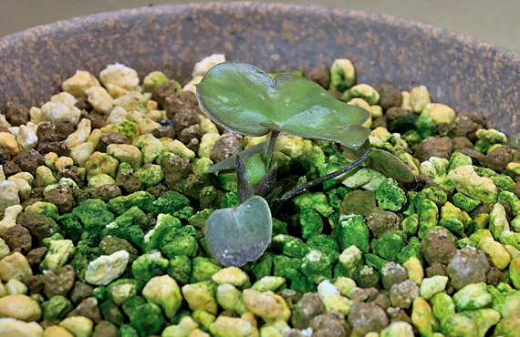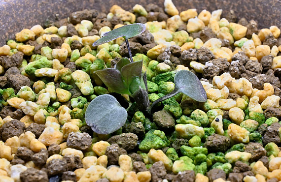 つい1ヶ月前には発芽時の2枚葉と少々手傷を負った本葉1枚にツボミが1個・・・という具合で、真っ先に花が咲くに違いない、という雰囲気を醸し出していた、素性不明の雪割草の実生2年株でした。その頃には、ツボミの左側にカサブタの様に小さなものがくっ付いていたものが、いつの間にか本葉として前面にしゃしゃり出て、形勢が逆転してしまいました。上画像はその本葉の様子です。お陰で、この品の正体の判明が大幅に先送りになりそうです。 ツボミに何か異変が生じた・・・というものではなさそうで、今はスタミナの大半を葉っぱが使っている模様ですが、ある程度まで成長すれば、再度ツボミに重点が移るものと思われます。その時期が半月か1ヶ月伸びることになりますが、その時を楽しみに待つことにします。