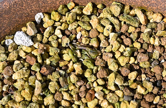 夏草の立場に立てば、このクソ寒いさ中では、寝るか死んだふりをするのが最良の選択です。そうした中で、この品、セッコクが、世の中の動きに逆らう様に分身を生成しています。と言っても、分身が発生したのは秋も深まった頃でした。ここに来て頭頂部や根の先端に凍傷と思われる色の変化が出始め、このままでは凍死し兼ねない状況に立ち至ってしまいました。 で、茎の先端で発生した新子を切り離し、親株たちの培地の空き領域に植え付けることにしました(円内)。凍傷気味の新子が、寒のさ中に定着できるかどうか見通しは明るくはありませんが、当面は屋内に置いて様子を見ることにします。