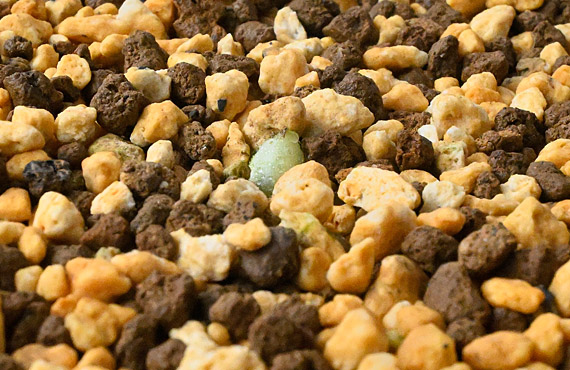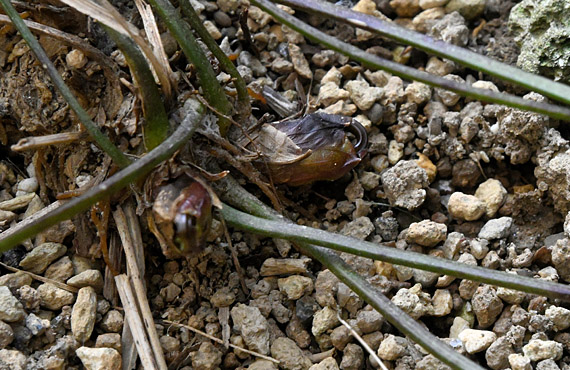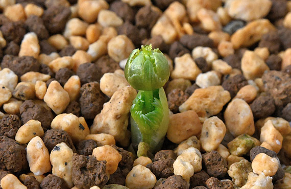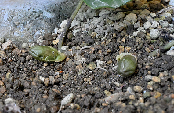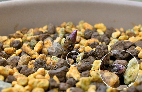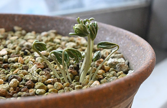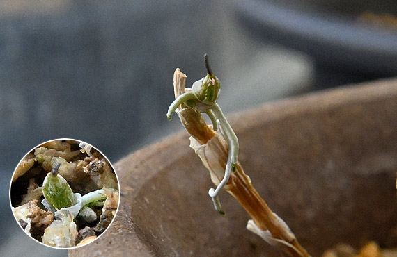 コシノコバイモの発芽が始まって3週間余り経過しました。この間、茎の部分はどんどん伸びるものの、種子の皮というか殻というか、とに角おツム部分を持ち上げる体力が茎に備わっていなかった様で、長い間オメガ(Ω)型の体型を維持して来ました。因みに、現在の発芽数は20芽ほどに達しています。 ここに来て、その体力問題にも目途が付いた様で、殻付きの頭部を持ち上げるものが出始め、その点数は5芽を超えました。次なるステップは頭部、じゃなくて葉っぱが外に出る・・・という段階になりますが、これがまた大仕事になりそうです。ルーペで覗き見ても、殻はかなり分厚く、葉っぱの成長力だけでこの殻を押し割るのは手こずりそうです。