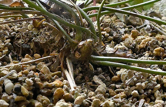 先週の前半頃だったと思いますが、セツブンソウの芽出しが始まったことを紹介しました。その時点では、そのポットは実生2年目の若齢品専用なので、この春、花を咲かせることはない・・・と付け加えていました。ところが・・・・ 始動を確認した時点では、地べたにペタンと寝転んでいたものが、ここに来て茎が立ち上がる様になりました。その立ち上がった茎の中に1点だけツボミを隠し持っているものが見つかりました(中央部の背の高い個体)。つまりこの一群は若齢株などではなく、開花適齢株であることを主張していることになります。昨年、種蒔きポットからこのポットに植え替えた際、一年株と熟年株を合流させたのかもしれません。記憶はかなりあやふやですが.... 尚、上画像に収まった一群には、全部で9芽が立ち上がっていますが、全て1個の球根から立ち上がっている様です。内、ツボミを抱いたものは1芽だけですが、昨年夏場の休眠中に甚だしい暑さに襲われたことで、疲労が溜まっているのかもしれません。