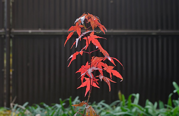 この辺りの平均的な紅葉時期より1ヶ月遅れてイロハモミジが紅葉しました。ここまで冷え込む時期に至っての紅葉は「遅れて・・・」いるというより、「変調を来して・・・」、若しくは「狂って・・・」と表現するのが適切かもしれません。いずれにしても、この葉っぱが散れば改めてゆっくり休めることになります。 この品は昨年秋に購入したもので、その頃の丈は10cmほどでした。7本ほどがポットに植えられていたものを分散して露地に植え替えていました。内2本が異常なスピードで成長し、最大で60cm、2番手のこの個体は50cmまで成長しました。最大株は世間並みの時期に黄葉して休眠に入りましたが、小さい個体群は黄葉したかどうか、それが何時だったかも確認していません。