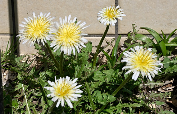 サクラも咲き始めようか、という様な暖かさになりました。その動きを先取りする様に、白花タンポポが爆咲きモードに突入しました。この様なコロニーが4ヶ所ありますが、1ヶ所を除いて、この程度の賑わいを見せています。1週間ほどで暖かさも一休みの期間がありそうですが、ことここに至っては、2日や3日の寒気は殆ど気に留めることはなくなります。この賑わいが4月中旬まで続き、弾(ツボミ)を撃ち尽くした後、徐々にタヌキ寝入りモードに入ります。梅雨入りの頃には休眠入りし、姿を消す・・・というのが、この品種の年周期の生活のリズムです。