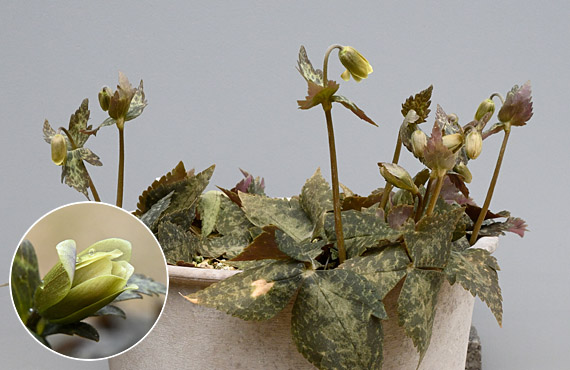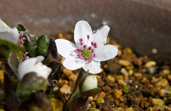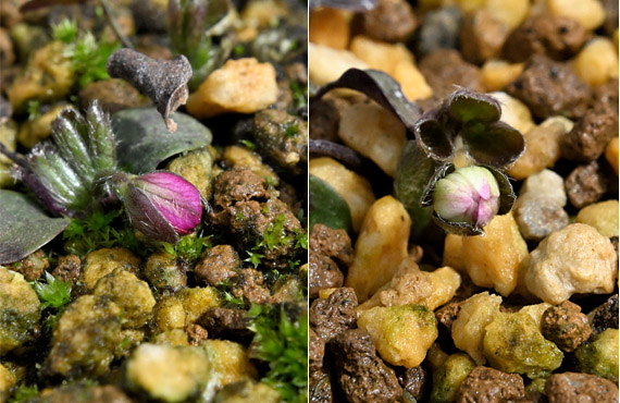 実生2年の雪割草の選抜品を屋内に収容していた1点で、順調に育っているかに見えていたツボミが立ち枯れした、という嘆きの一件を1/27にこの場で紹介しました。今年は花付きは絶望か・・・と半ば諦めていたのですが、ここに来て新たな展開がありました。 新展開というのは、寒風吹きっ放しの屋外に放置した苗の中から、2株にツボミの生成を確認したことです。実生2年という最短での花付きは赤飯ものでではありますが、小さくない疑問もあります。上画像の様に、1品種からの種子採種だったのに花色が違っていそうなツボミが生成された点です。開花までに多少の変化はあるかもしれませんが、どんな色の花が咲くか大注目です。