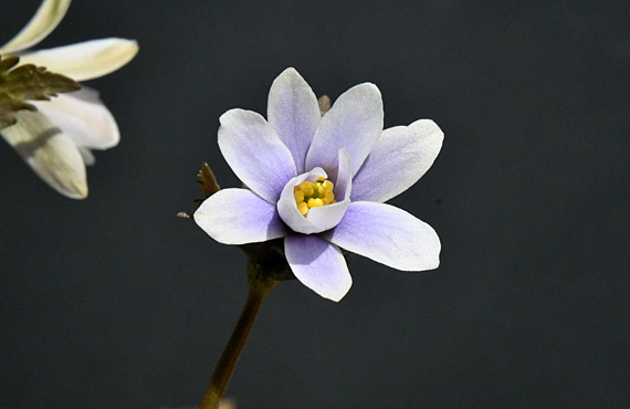 ユキワリイチゲが開花しました。昨年と比べて10日遅れの開花です。定型句になりかけていますが、昨年の暖冬と今年の厳冬に照らして、「さも有りなん」という印象です。 この品は先月末頃からツボミは半開き状態になっていました。生憎、その頃は記録的寒波のさ中で、ツボミは半開きのままフリーズ状態になっていました。ここに来て、そうした寒さの縛りも取れて、速攻で開花まで進んだ様です。この品種は夏場は休眠しますが、暑さには比較的耐性がある様で、この4~5年で3鉢まで増えてしまいました。置き場所の制約にも抵触し始めており、この秋の手入れでは個体数の削減に手を付ける必要がありそうです。