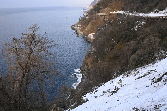 昨年夏の高温で約半数の品種を失ったのを穴埋めする目的で、今日と明日、新潟市で開催される越佐雪割草展に向けて新潟県に来ています。 ルートの途中にある親不知海岸を、これまでは国道脇のビューポイントから眺めるだけでしたが、今回は少し深入りして、できれば明治初期以前には通っていたという波打ち際まで下りてみたいと思い立ち寄ってみました。生憎先般の豪雪で下りの階段が完全に埋まっており立ち入ることもできませんでした。で、歩ける範囲…ということで、波打ち際から100mほど上に設えられた遊歩道から眺めることにしました。画像はその遊歩道から北方向を写したものです。 昔の人々、中でも有名人としては芭蕉先生は、奥の細道からの帰路、この波打ち際を歩いて大垣に向かったそうです。明治に入って、画像中央やや上に築かれているコンクリート護岸の辺りにトンネルを掘って、北陸道随一の危険なルートは解消されたそうです。今回は芭蕉先生が歩いた波打ち際には立てませんでしたが、別の機会に改めてトライしてみます。