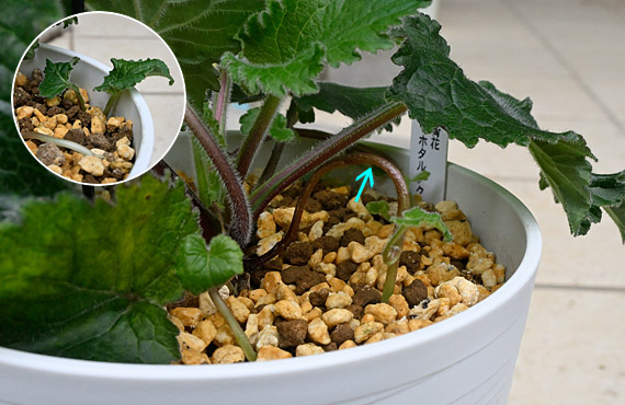 この冬の間、青花ホタルブクロの若株1点を屋内に収容して過ごさせました。この間、屋外の個体が休眠している間も、屋内の個体は休まずに成長を続け、面白い振舞いを見せてくれました。 そうした振舞いの中で、特に興味深かったのが、匍匐枝による増殖です。この品の仲間は地中を這う様に、時に空中に跳ね上がりながら枝を伸ばし、自身の分身を生成してファミリーを増やすという裏技を使います。上画像がその様子で、地中を這って伸びていた匍匐氏がポットの壁にぶつかったものの、成長を止めなかったため、伸びた匍匐枝が逆U字型に盛り上がった様子です(矢印が該当部位)。匍匐枝にはところどころに枝葉を生成し、その枝葉を拠点にして子株を作り上げます。円内がそうして作られた子株です。このポットではこれまでに7本ほどの匍匐枝が確認できていますが、多分10株を超える子株が出来上がると思います。いやはや何とも旺盛な生命力の持ち主ではあります。