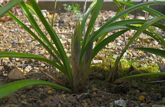 一昨日は日中家を空けたため、小庭の動きも全く掴めていませんでした。で、昨日外に出てみると、ご覧の通り花芽が大きく伸び上がっているのが目に飛び込んできた次第です。この時期、1日か2日目を離そうものなら、状況が様変わりすることも珍しくありません。 昨年の植え替え時の様子を振り返ってみると、花芽は3芽確認できました。ということで、まだ1芽が地中で身を潜めていることになります。各々の花芽で、少なくとも2輪、調子が良ければ3輪の花を咲かせるので、今年は6~9輪が目を楽しませてくれそうです。但し、時期は少しずつずれるので、全員集合で豪華絢爛という訳には行きませんが ....