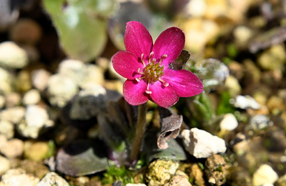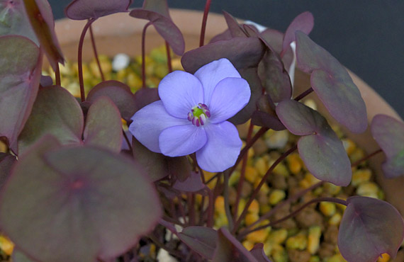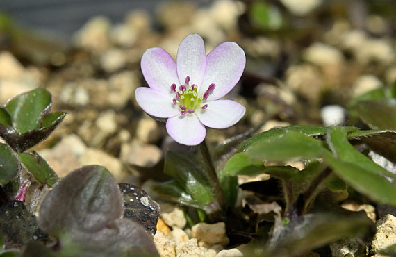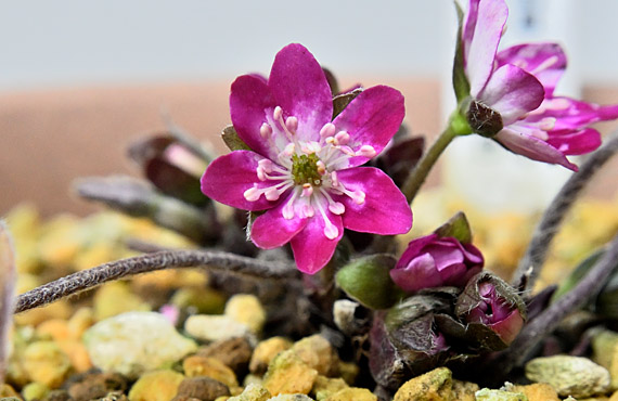 実生2年の雪割草で最初の1輪が開花しました。この1年、何回かこの場で取り上げて来ましたが、都度「正体不明品」だの「不詳品」として扱ってきました。ここに至って、その正体がやっと明らかになったことになります。 で、花は?というと、ご覧の通り標準花で濃赤の品でした。遡って親株を辿ると、我が家では「無銘②」の仮名称を付して識別している品種でした。親株は2週間早く開花しましたが、厳しい寒さに揉まれたせいか花弁の色むらや色褪せが見られました。対して2代目グループの1番花は?、というと、色の鮮やかさ、ムラのない点など、色々な点で親株を上回る出来栄えです。この個体に続く2番花は花弁の裏が白く、1番花とは一味違う趣向を見せています。今日か明日には開花するかと思います。