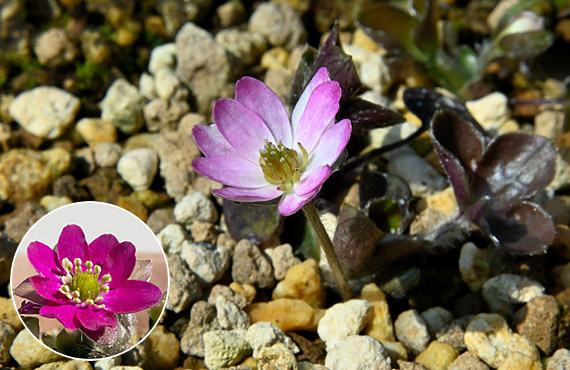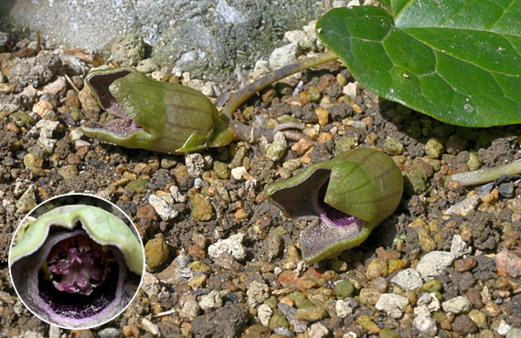 コシノカンアオイ(越ノ寒葵)が開花しました。昨年と比べて8日遅れの開花です。暖冬だった昨年と記録的な寒さと言われた今年を比べると、この程度の遅れ幅に抑えられたのが不思議な印象です。何はともあれ、無事に開花できたことや昨年1個だった花が今年は2個に増えたこと、等々、メデタさ倍増です。 ところで「開花」などとお気軽に使っていますが、開いたのは花ではなく萼片です。花はこの固い萼片の中に大切に保護されていて(円内)、顔が地面に着くぐらいに下げないと見ることはできません。栽培を始めて10年余り経ちますが、種子を結んだのを一度も見たことがありません。「ものは試し」で、今年は人工授粉を試してみようか・・・などと良からぬ企みを温めています。